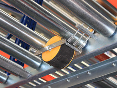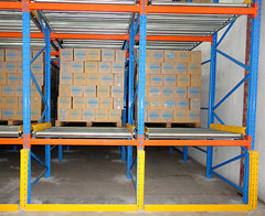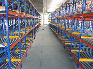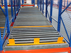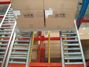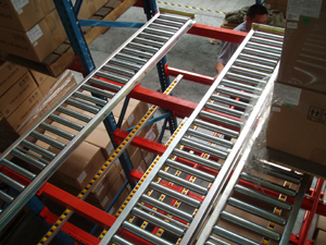 滾筒線(xiàn)按一定角度傾斜固定在貨架橫梁上,托盤(pán)從高端放入,沿滾筒線(xiàn)靠本身重力下滑,為控制托盤(pán)以穩定速度下滑,避免撞擊,在滾筒線(xiàn)上每隔一定距離設置一套阻尼系統,托盤(pán)下滑速度越快,阻尼系統產(chǎn)生的阻力越大。端部分離機構設置在低端,用來(lái)分離低端相臨的兩個(gè)托盤(pán),這樣低端托盤(pán)就可以順利地取出。重力式貨架的空間利用率又高于后推式貨架及貫通式貨架,而且實(shí)現了“先進(jìn)先出”的原則,安全性及運轉效率都與貨位式貨架相同,廣泛應用與各行業(yè)。