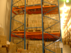 壓入式貨架主要由柱片、橫梁、軌道、運載小車(chē)組成。軌道按一定角度傾斜固定在貨架橫梁上,運載小車(chē)沿軌道運行。由前方將托盤(pán)貨物推入,托盤(pán)物品置于滑座上,后來(lái)填入的會(huì )將原先的推到后方,目前可推入五個(gè)托盤(pán);缬诨壣,滑軌本身具有傾斜角度,滑座會(huì )自動(dòng)滑向前方入口。整體結構采用“**”原理,托盤(pán)放置在運載小車(chē)上依次被推入貨架內部,存取方式與貫通式貨架相同,但叉車(chē)不需要進(jìn)入貨架內部,由于在貨架深度方向可以設計為多個(gè)托盤(pán)位置,后推式貨架的空間利用率高于普通貨架。安全性及運轉效率都遠高于貫通式貨架,廣泛應用與冷庫、圖書(shū)、電子等行業(yè)。