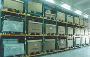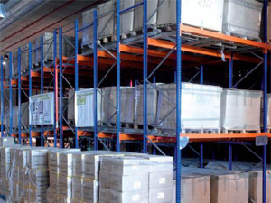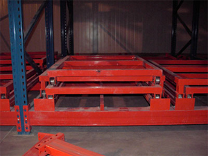 后推式貨架系統(也稱(chēng)為壓入式貨架),此貨架系統高效地利用了存儲空間,經(jīng)常用為物流中心貨架。依據“先進(jìn)后出”的原則把貨物放置在傾斜的滾道上,運載臺車(chē)沿軌道運行,托盤(pán)放置在運載臺車(chē)上依次被后推至貨架內部,有效深度在5個(gè)托盤(pán)位,取貨時(shí)第一個(gè)拉盤(pán)提取后,下一個(gè)托盤(pán)自行滑至取貨點(diǎn),有效地利用單一通道進(jìn)行存取,尤其適用于貨物中轉區的存儲管理。