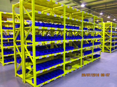 采用柱片與橫梁掛接的結構,易為插接組合式,橫梁以50mm節距調節層高,適合于承載大且橫梁較長(cháng)的情況下,通常每層載重量在350-800kg時(shí)使用較合適。層面可鋪鋼板、亦可鋪木板(原木木板、中纖板、帖塑刨花板等)。
