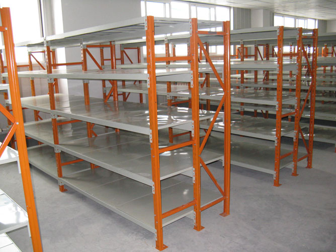層板貨架采用扣接式結構,拆裝方便,層間距可依據貨物高度以每50mm為單位上下調節,其承載范圍可達150-500kg/層。層板可以選用鋼板、木板、中密板等材料。此種貨架高度適宜,方便人工存取貨物,是中小型倉庫的倉儲產(chǎn)品。